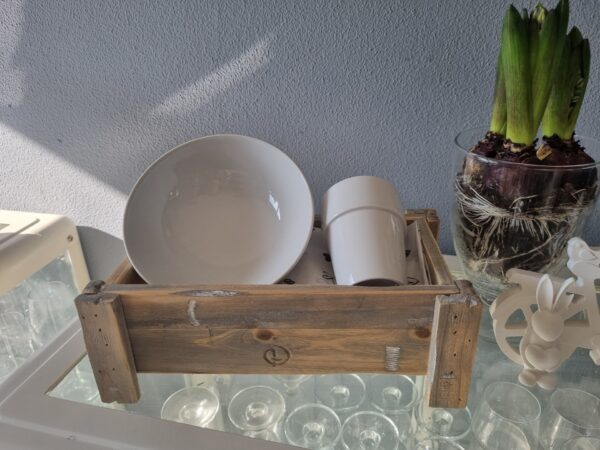 Deze leuke set wordt geleverd met een houten bak , die daarna dienst kan doen om luiers of andere baby spulletje in op te bergen.