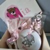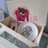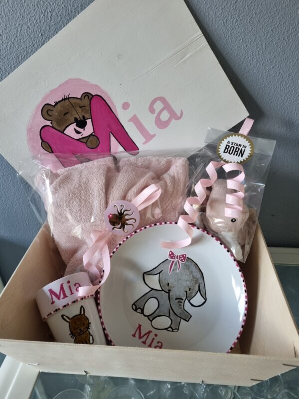 1 houten bakje met  vaste print print zoals op de foto staat of 1 kratje met deksel die wordt voorzien van 1 onderdeel van het geboortekaartje